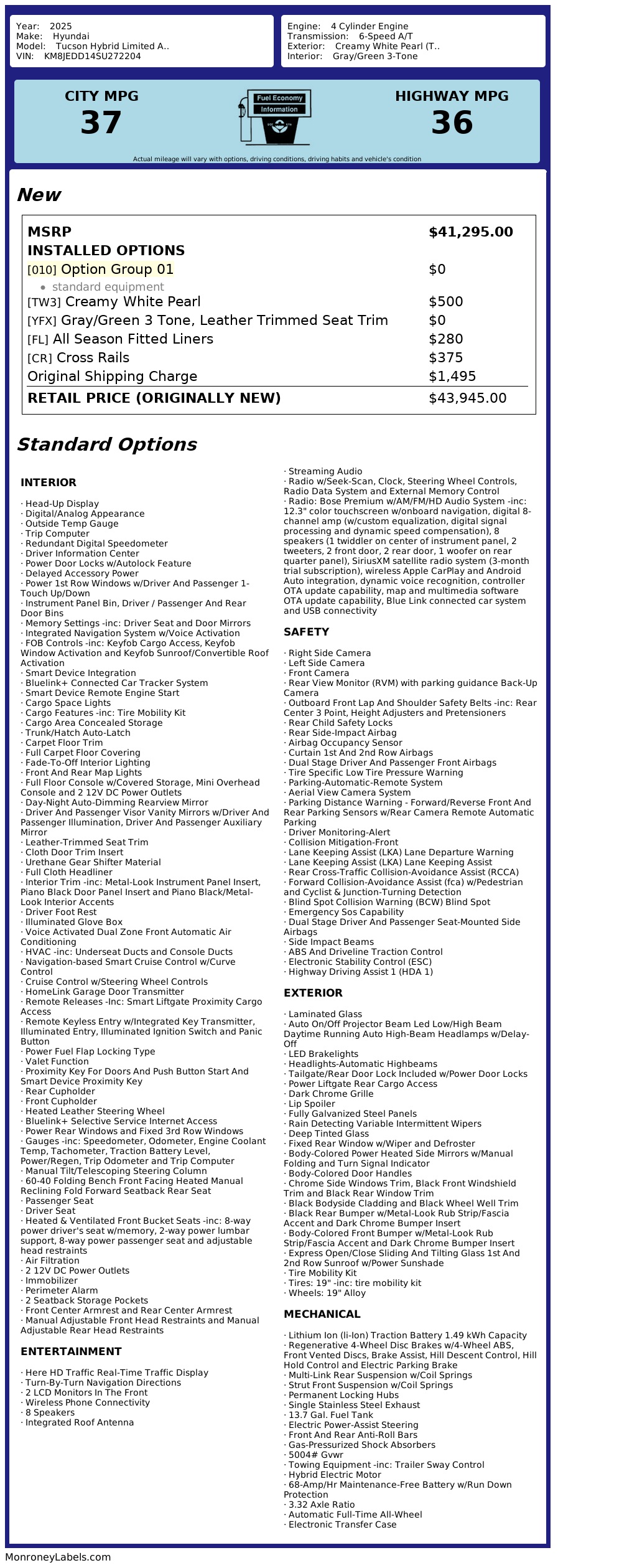 Location: Warehouse F 1/29/2026 || 19951 TUCSON HYB LTD BB-engine,HUD,LTHR,PANO,PLG,NAV,H&CS,PS || Optional 5yr/100k Bumper to Bumper Service Contract: $1602 || Original MSRP: $43654 || Title Status: Mfg Buyback || Title State:PA