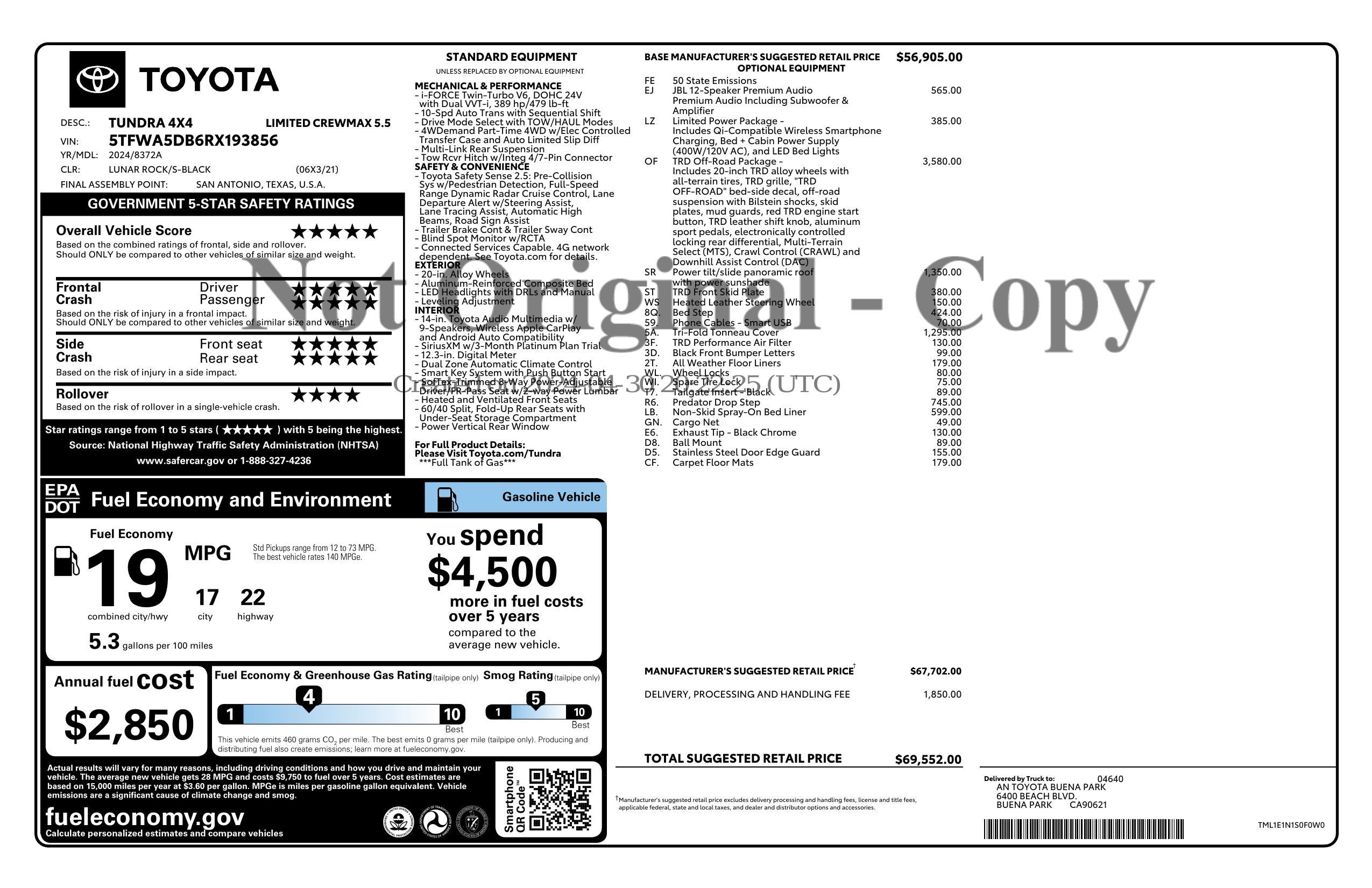Location: Lower H 3/12/2026 || 21077 TUNDRA LTD C,LTHR,SR,NAV,H&CS,PS || Optional 5yr/100k Bumper to Bumper Service Contract: $1754 || Original MSRP: $69552 || Title Status: Clean || Title State:CA